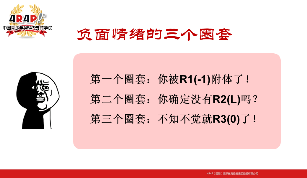 你如果真有像这种情绪失控的情况,那么我提醒你,这也叫R1(-1),你R1(-1)附体了!换句话说:冲动让你从妈妈、爸爸变成了大灰狼、狮子、老虎甚至是魔鬼。这就是负面情绪的第一种圈套:你被R1(-1)附体了!