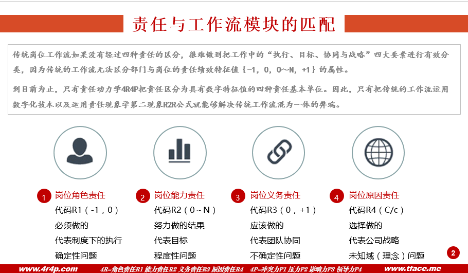 到目前为止,只有责任动力学4R4P把责任区分为具有数字特征值的四种责任基本单位。因此,只有把传统的工作流运用数字化技术以及运用责任现象学第二现象R2R公式就能够解决传统工作流混为一体的弊端。为了解决这个问题,我们首先需要把责任与工作流模块进行匹配: