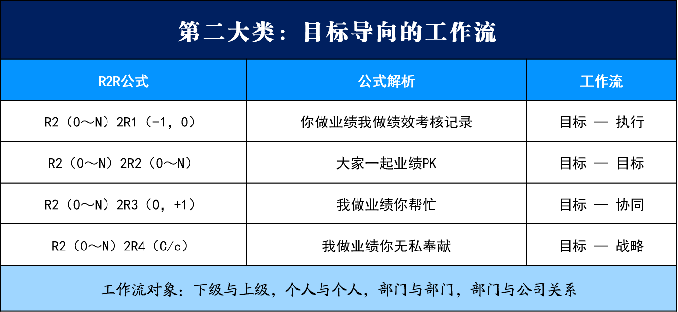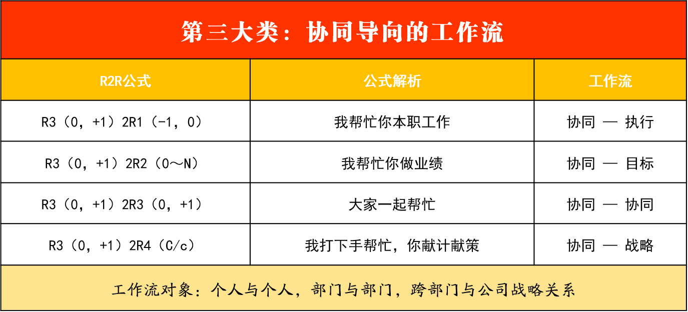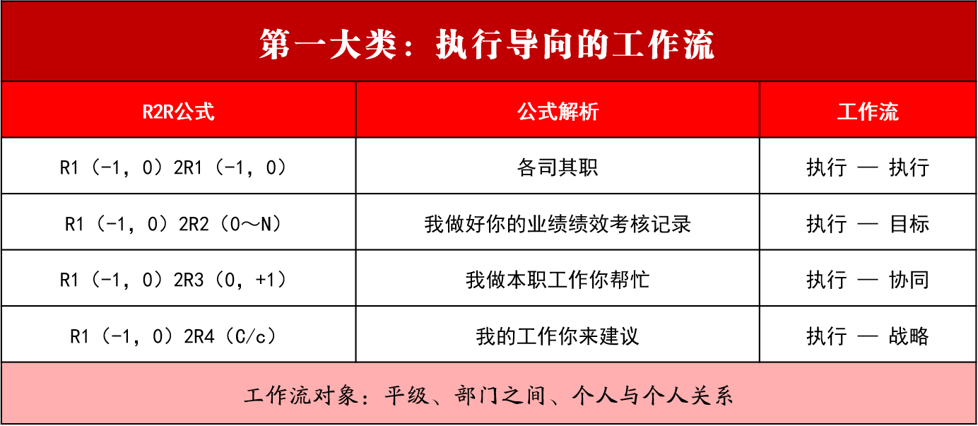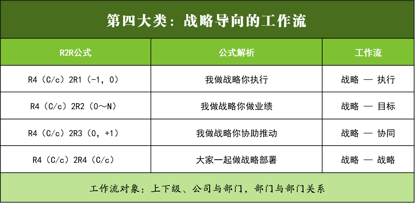 接下来,我们就可以运用责任现象R2R公式矩阵对工作流分类后,任何岗位与岗位、任何部门与部门,以及任何上下级的工作流类型都可以揽括为以下16种: