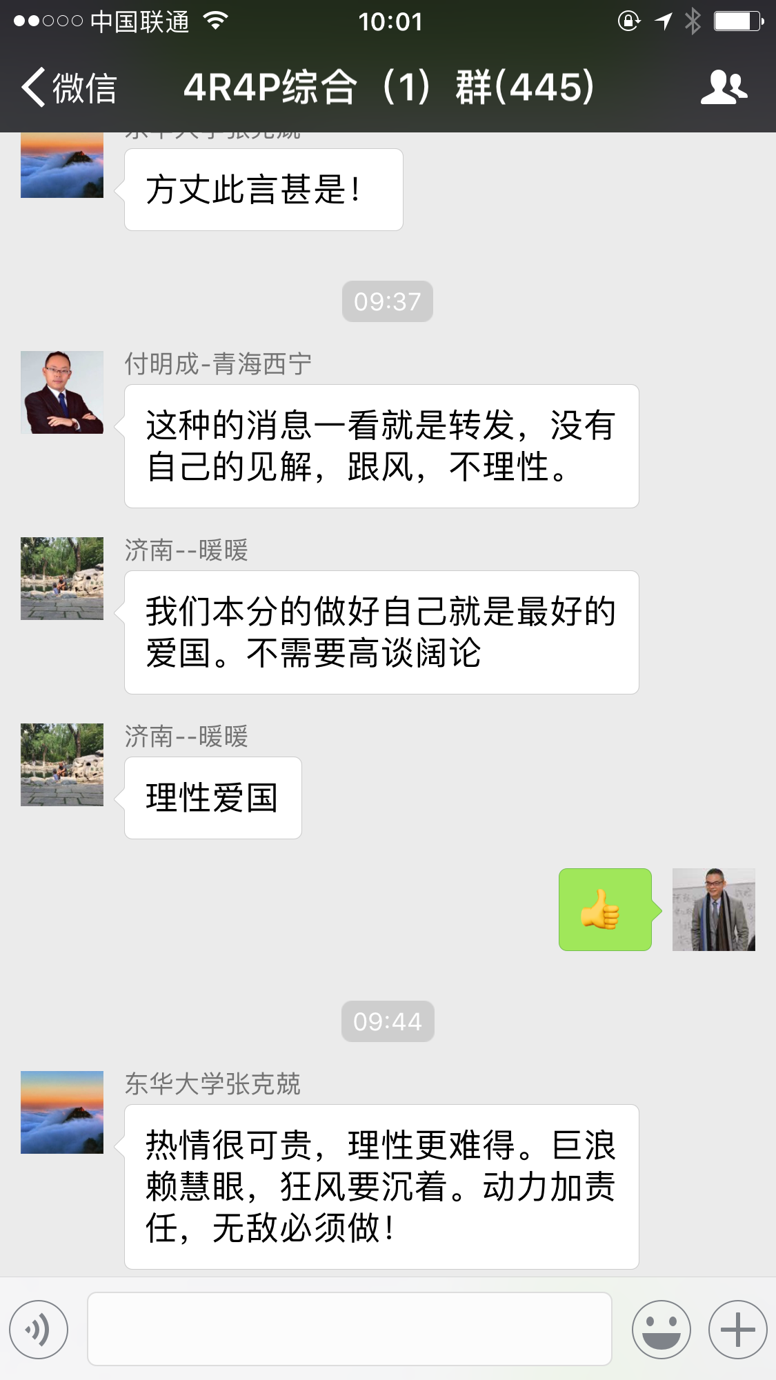 于是回复:“别在这个群中“忧国忧民”,这些我们都能够在其他媒介看到,多用心自己岗位工作比什么都强。爱国不是“激进”运动!职场中人,不要被极端的民粹思想所绑架,多一点理性责任思维比什么都强!”