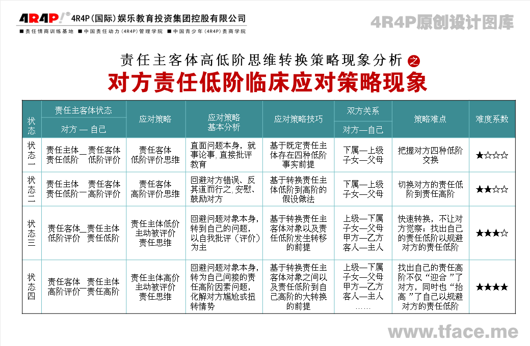其次,当存在不利因素或条件时候,尽量从驱动力角度思考行动。根据条件判断自己或他人作为责任主体时,这个责任主体是低阶还是高阶,如果是自己低阶,该如果驱动对方作为责任主体高阶;反之,如果是对方责任低阶,但有的时候介于某种目的,怕影响事态的正向发展,我们又不能够或不好意思直接评价,这个时候就需要我们考虑,是否可以把问题转移到自身的责任约束力思维上,把自己的责任约束力归因为问题的导致的根源,化解对方的尴尬,也对整个局面达到了控制意义。当然,还有一种技巧,也不要太为难自己,不用太“低三下四”,而是把问题归因我自己的责任驱动力思维。也就是说,把对方责任低阶问题转移到自己的责任驱动力思维的某个特定的高阶思维上,从而根据有智慧,化解了彼此的尴尬局面。