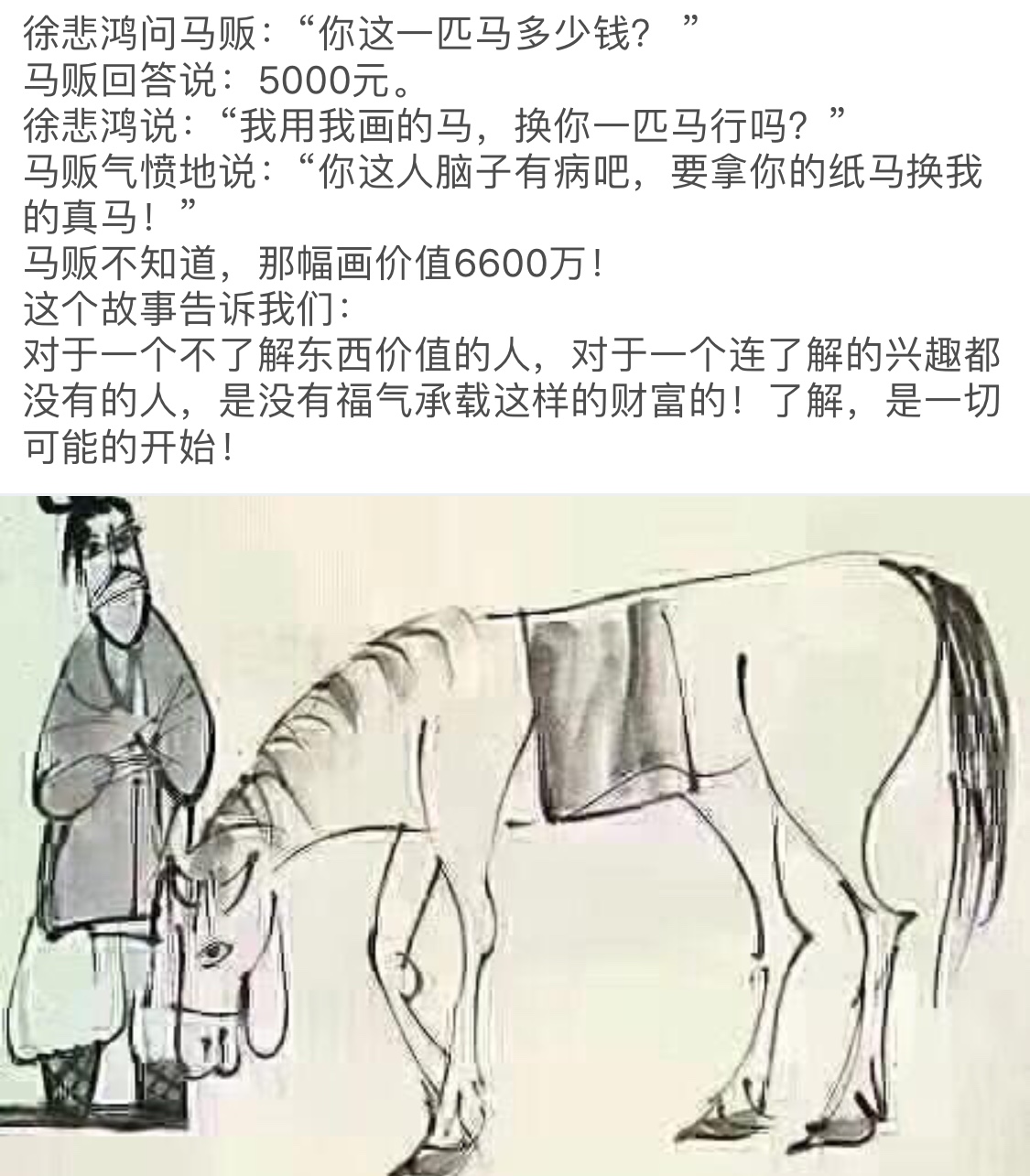 图文貌似马贩子的问题,其实不然,这里就差一个“交往理性”,马贩子无法从自己日常交往中获取对徐悲鸿画有效的价值判断信息。任何奢侈品的比较价值都是居于具有共同价值认知的阶层而言,对于不同阶层来说,没有任何交往的机会,则更没有认知的可能。一句话存在交往理性问题,交往理性的两个对象,涉及不同阶层言谈者(马贩子-徐悲鸿)之间的对话关系。