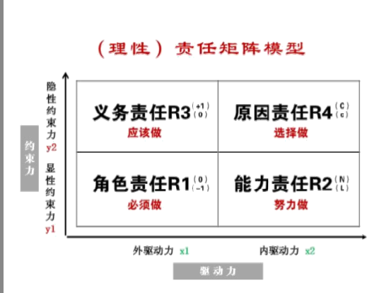 R=R1(-1):角色在规则下必须做的事,数学逻辑特征值为(-1,0),R1(-1)意思为违反了规则范围内的事情,属于角色责任低阶的表现。比如:公司规定九点上班,小王九点半上班,小王迟到属于必须做的事情没有做到,属于R1(-1)。