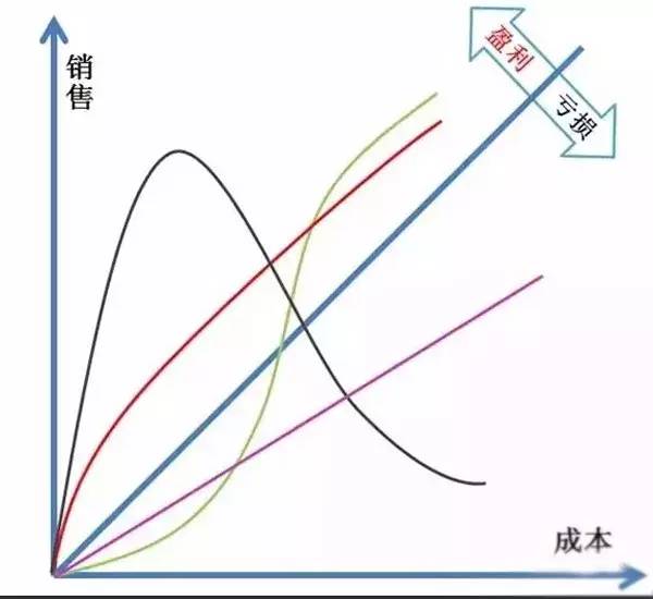 如上图所示,正常状态的企业应该是绿色的线,刚开始会亏损,通过营销、降低成本、提高效率和质量等措施营业额不断地攀升并实现盈利。