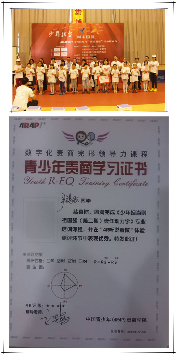 本次活动主要是衔接2015年05月24日的《少年担当则祖国强暨江苏无锡天一实验小学数字化责商教育》第一阶课程而延续的行为养成培训课程,此次课程以平日生活和学习中的“听、说、看、做”为主线,让孩子和父母学会如何将责任动力(4R4P)学的基本理论知识——“四做”(必须做、努力做、应该、选择做)和“四种责任”(角色责任R1、能力责任R2、义务责任R3、原因责任R4)运用到实际的生活和学习中。主讲老师分别为中国青少年(4R4P)责商学院、中国责任动力(4R4P)管理学院高级责商导师高峰老师和专业责商导师牛飞峰老师。