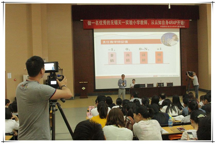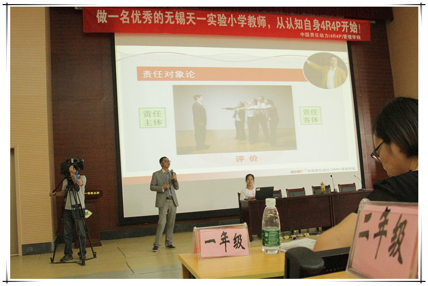 走进培训现场,江苏无锡天一实验小学的300多名教师们已经就座。坐在最前排的,分别是该校的胡志强校长、季玲副校长等校领导。 中国责任动力(4R4P)管理学院、中国青少年(4R4P)责商学院总裁宋卓林先生,梁鸿野外拓展训练有限公司总经理谢萍女士也跟随学习。CCTV一发现之旅、CETV中国教育电视台、无锡电视台收视率前三的《今晚60分》、《第一看点》和《阿福聊斋》同时拍摄报道。