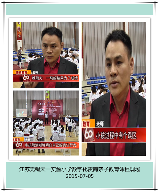 江苏无锡电视台《今晚60分》报道4R4P数字化责商教育课程 2015年07月05日,无锡电视台《今晚60分》栏目播出少年担当则祖国强暨江苏无锡天一实验小学数字化责商教育课程第二阶——4R4P数字化责商教育“听、说、看、做”增值影响力的相关报道。